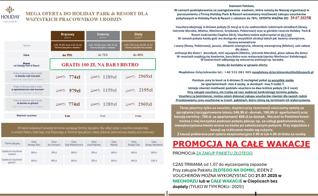 Przy zakupie Pakietu ZŁOTEGO NA DOMKI, JEDEN Z VOUCHERÓW MOŻNA WYKORZYSTAĆ CAŁE WAKACJE w Cieplicach bez dopłaty (TYLKO W TYM ROKU- 2025!)