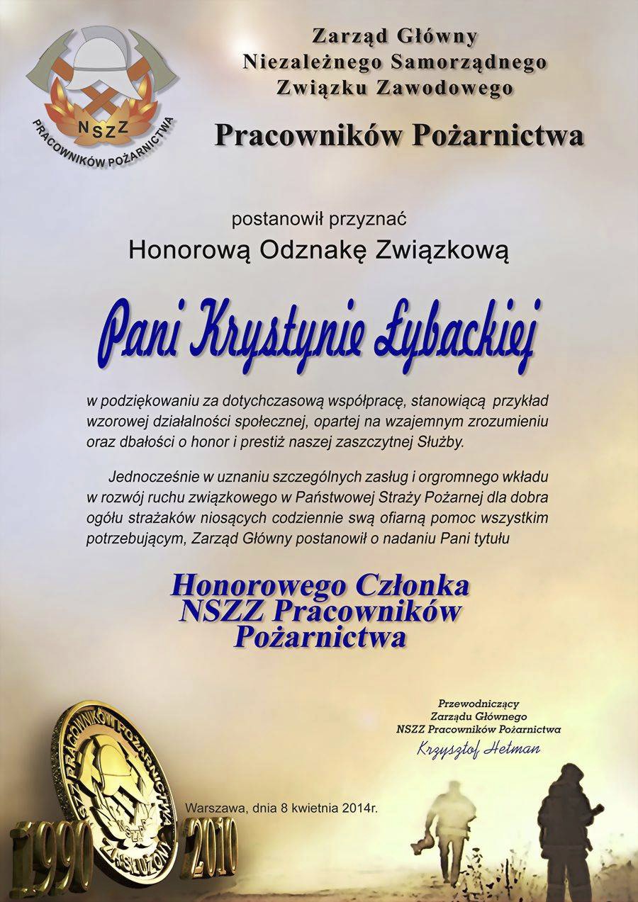 W dniu 8 kwietnia br., odbyły się wybory wojewódzkich władz NSZZ Pracowników Pożarnictwa na kolejną 4-letnią kadencję. Wyniki wyborów wskazują na pełną akceptację dotychczasowych działań związku zawodowego, w tym również w ramach wielkopolskiej Federacji ZZSM. Gościem honorowym była posłanka Krystyna Łybacka (SLD), która otrzymała zaszczytny tytuł Honorowego Członka NSZZ Pracowników Pożarnictwa w dowód wdzięczności za całokształt współpracy.