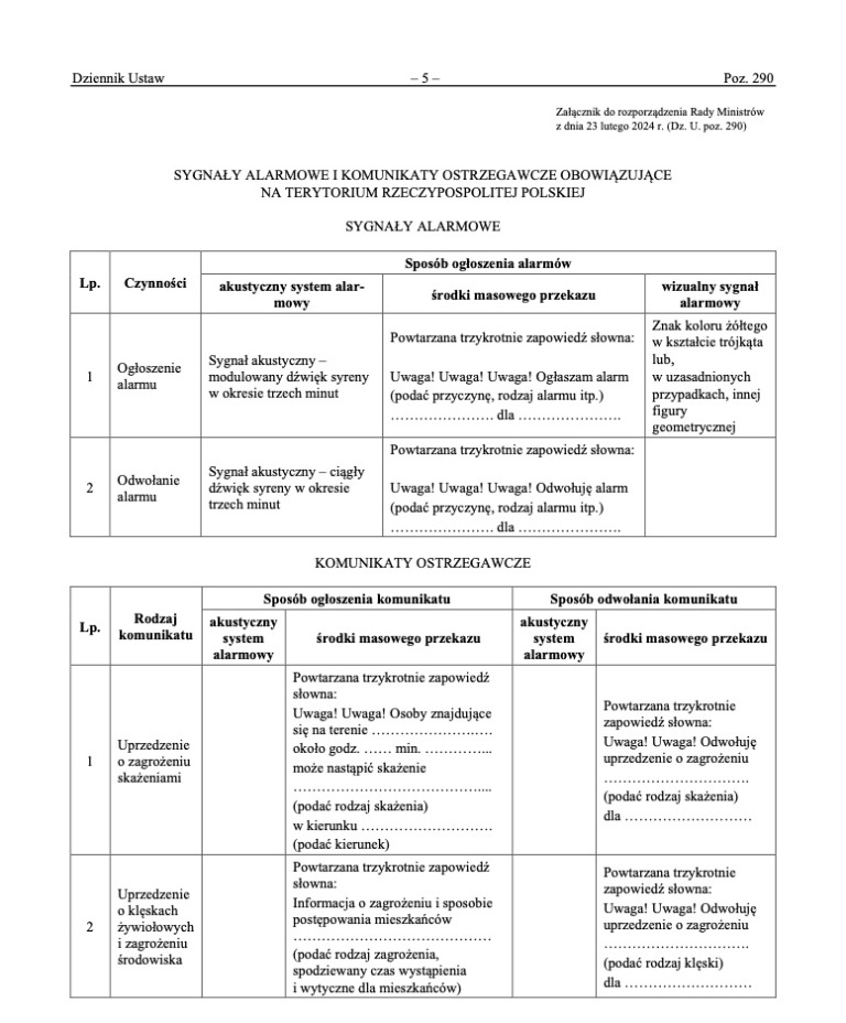 Załączona do rozporządzenia tabela określa sygnały alarmowe i komunikaty ostrzegawcze obowiązujące na terytorium Rzeczypospolitej Polskiej, które dotyczą wszystkich osób przebywających na jej obszarze.