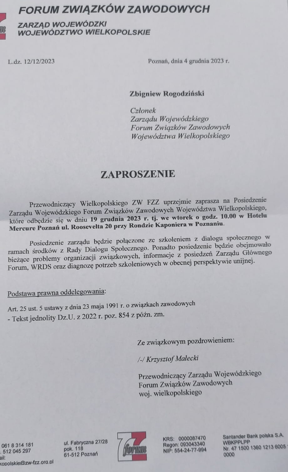 Przewodniczącego Zarządu Wojewódzkiego Forum Związków Zawodowych - Krzysztofa Małeckiego i uczestniczy w posiedzeniu Zarządu Wojewódzkiego Forum Związków Zawodowych