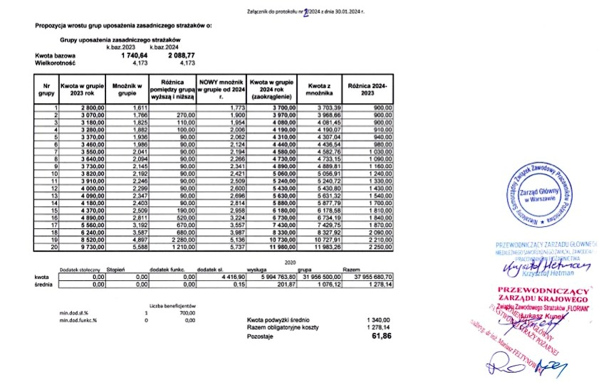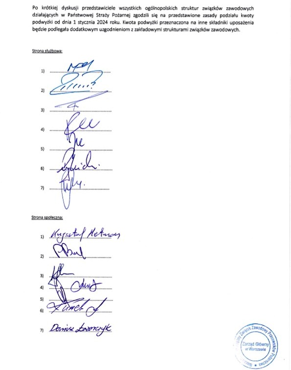 Przedstawiciele wszystkich ogólnopolskich struktur związków zawodowych działających w Państwowej Straży Pożarnej wspólnie i w porozumieniu zaakceptowali przedstawione zasady podziału kwoty podwyżki od dnia 1 stycznia 2024 roku. Kwota podwyżki przeznaczona na inne składniki uposażenia będzie podlegała dodatkowym uzgodnieniom z zakładowymi strukturami związków zawodowych.