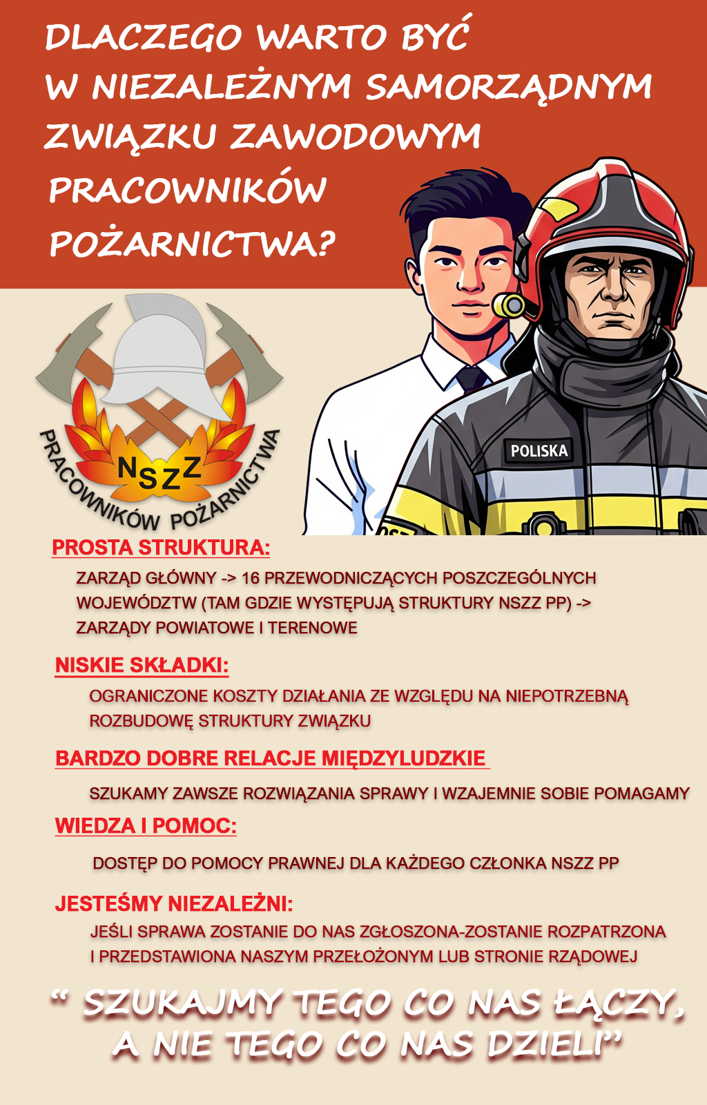 Rozumiem..., że zapadła decyzja i zdecydowałeś się przystąpić do związku zawodowego, a w Twojej komendzie nie działa jeszcze organizacja związkowa, która by ci odpowiadała...Nie musisz zaczynać od „zera”, proponujemy wstąpienie i przyłączenie się do Niezależnego Samorządnego Związku Zawodowego Pracowników Pożarnictwa ! ! !